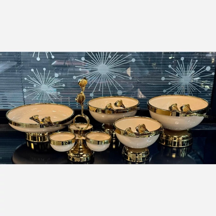 سرویس 5 تیکه لیلیوم رنگ کرم طلایی طرحی شیک جذاب هست رنگ استاتیک کوره ای و آبکاری فورتیک کوره که ماندگاری بالایی داره