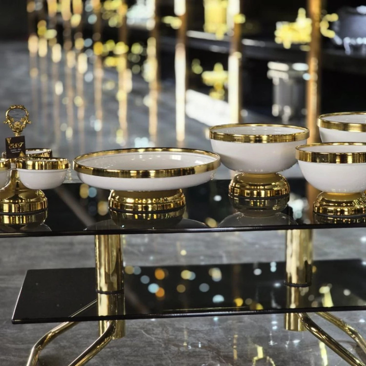 ست پذیرایی 5 تیکه شامل شیرینی خوری میوه خوری آجیل خوری شکلات خوری اردو خوری ست پذیرایی شیک وساده و قیمت مناسب از مزایای این مدل هست